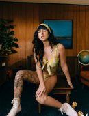 In a vintage Playboy photo session, Reed, a sexy tattooed brunette on roller skates, shows off her delectable natural tits and her pussy with a bush, just like in the 1970s.